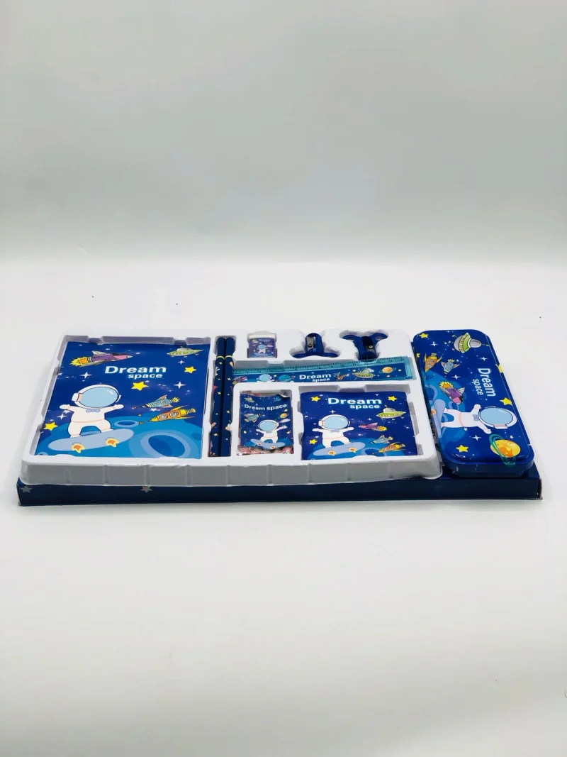 This set not only offers a striking outer space theme but also includes a perfectly matched stationery kit, giving kids a coordinated, stylish look.