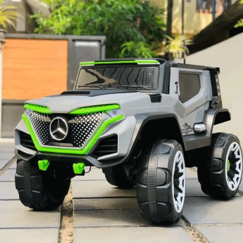 The first thing that catches the eye is the Mercedes-inspired styling — smooth curves, bold color accents, and premium detailing that make this jeep feel special from every angle.