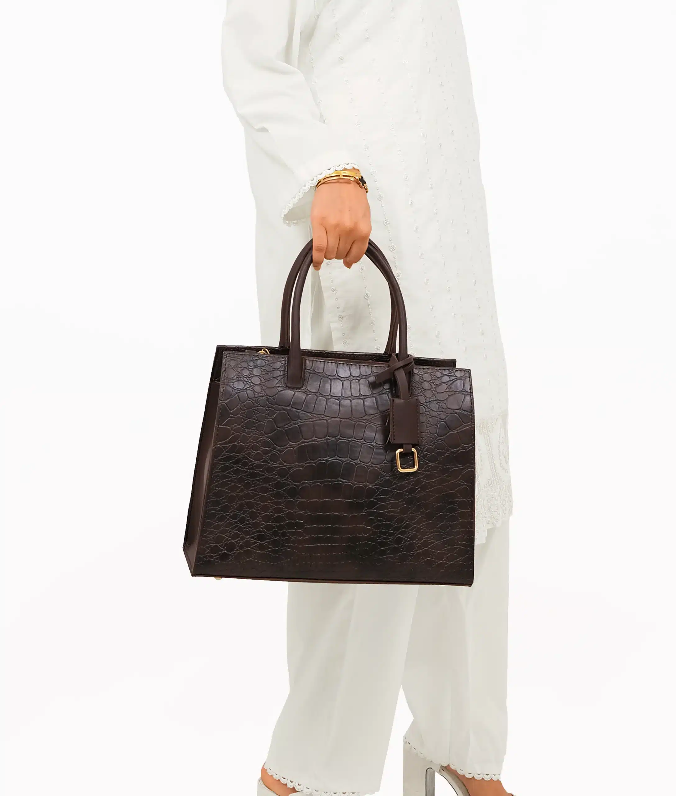 • The handbag showcases a rich dark brown crocodile pattern, exuding an air of vintage charm that complements both casual and formal attire.