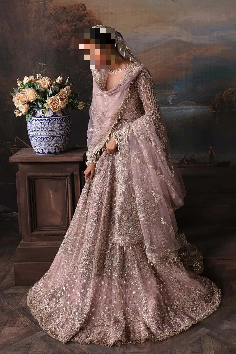In Ayesha’s Elegant Mauve Blush Bridal Dress, this shade becomes a canvas for detailed embroidery and refined design.