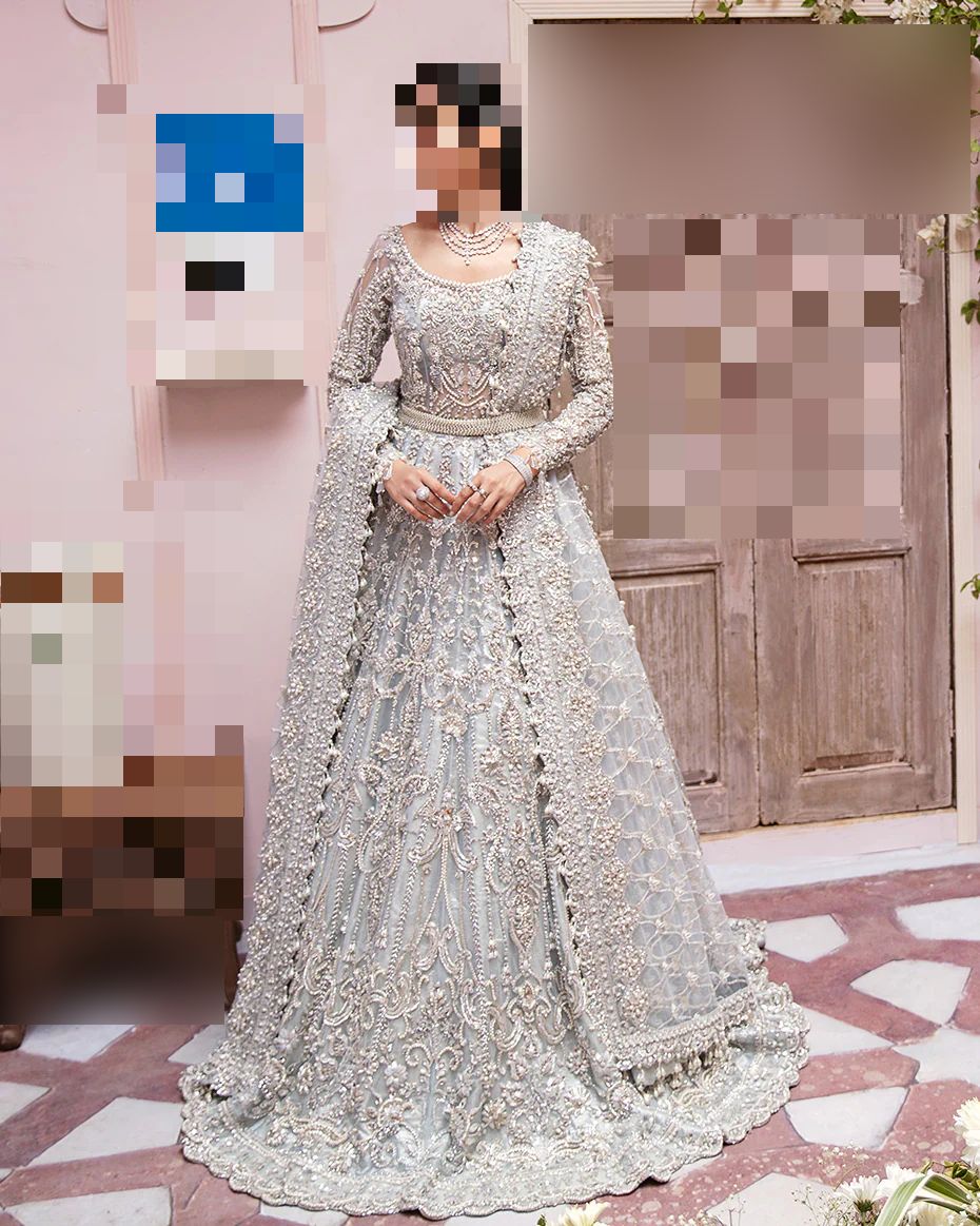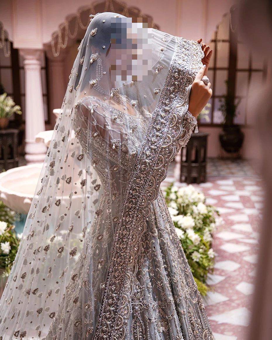 Ayesha’s Glacier Grey Bridal Dress suits nikah ceremonies, elegant receptions, and contemporary wedding celebrations.