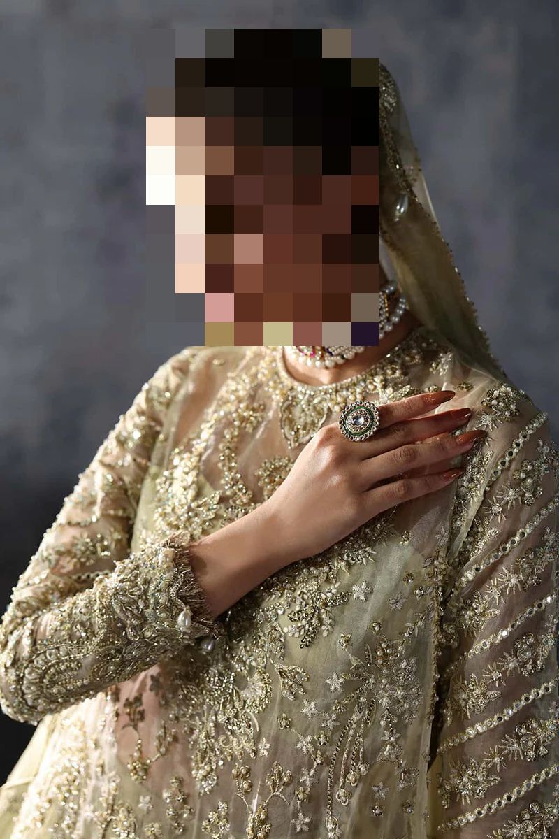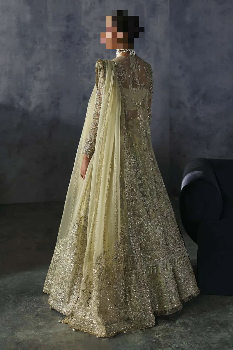 In Ayesha’s Pistachio Gold Bridal Dress, this hue feels luminous and poised while drawing attention to the rich embroidery.