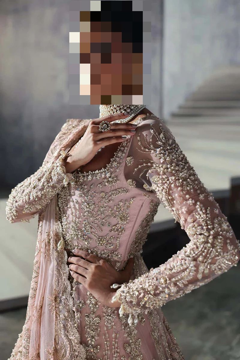 Ayesha’s Poised Vintage Pink Bridal Dress earns this distinction through its detailed handwork, gentle color story, and composed silhouette.