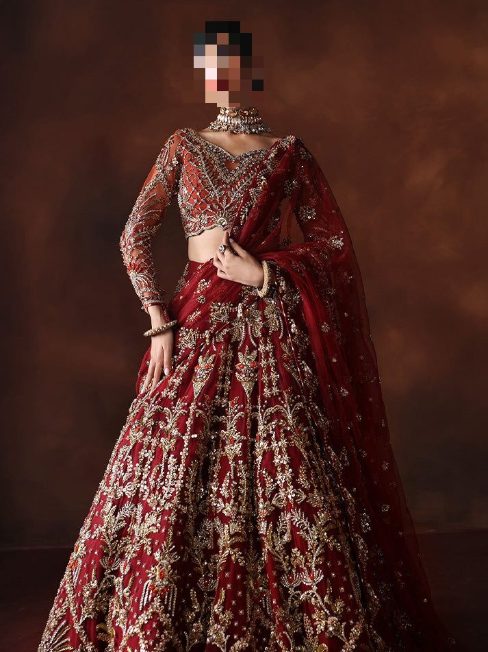 Bold, deep, and emotionally resonant, Ayesha’s Royal Wine Bridal Dress presents a bridal palette steeped in ceremonial significance and classic beauty.