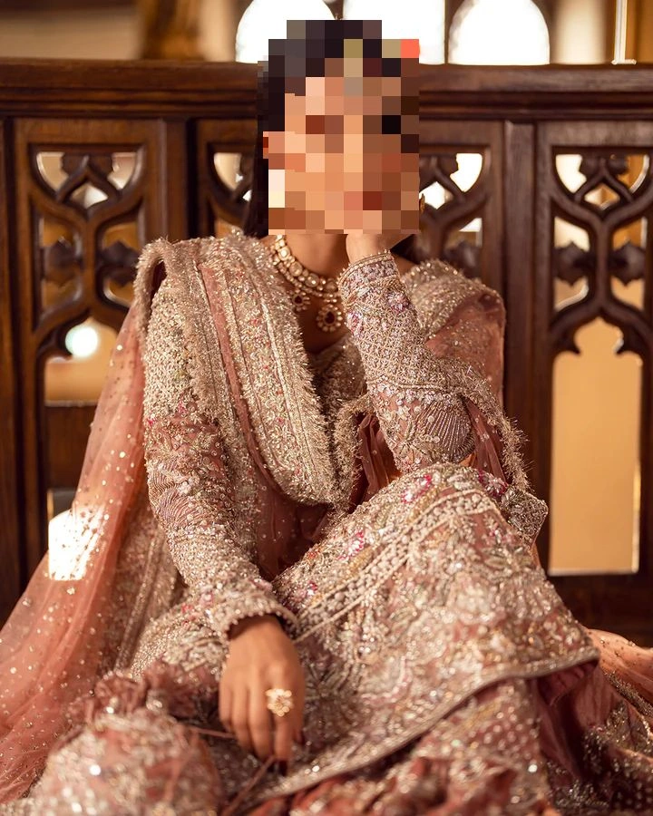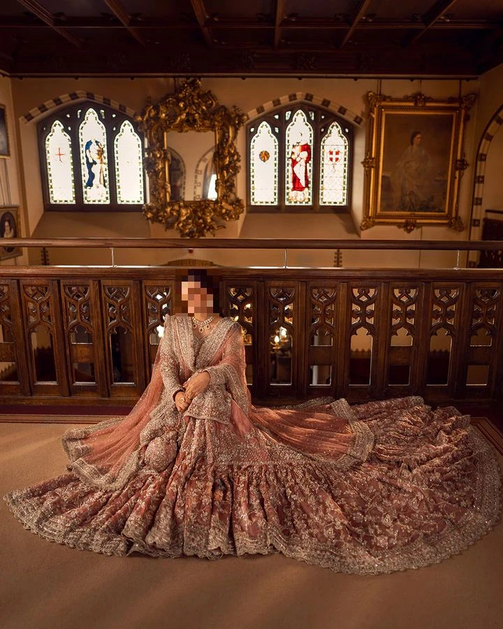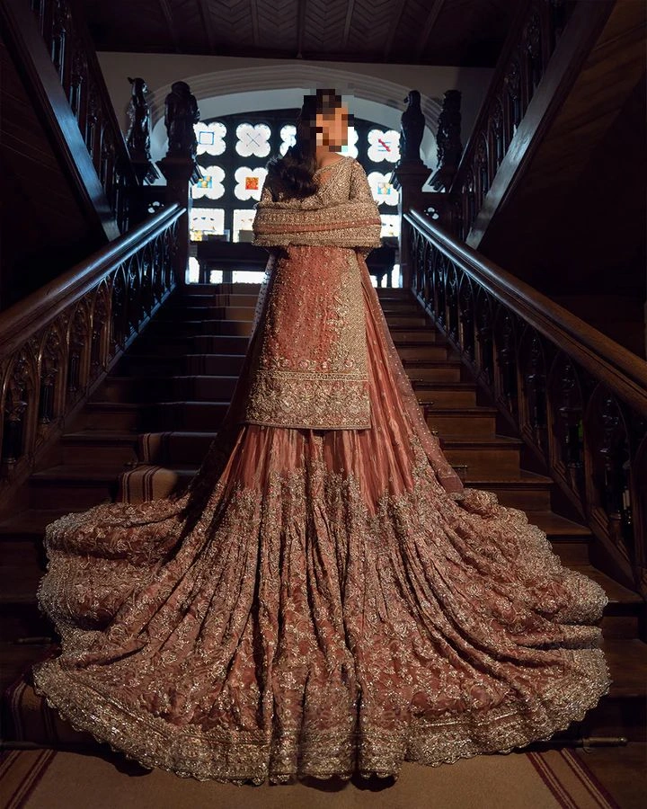 The fabric story of Ayesha’s Tea-Pink Bridal Dress plays a significant role in its elegance.