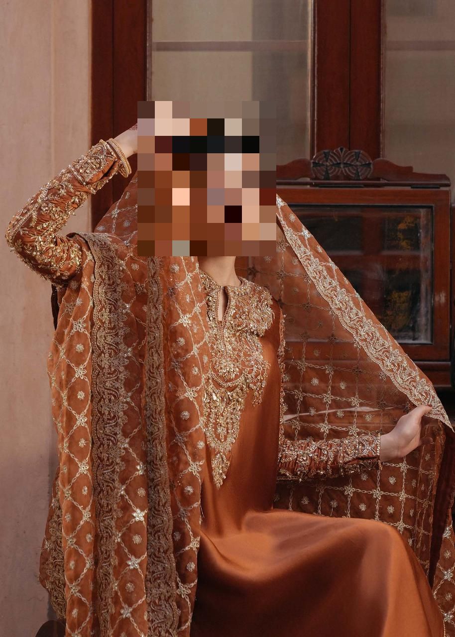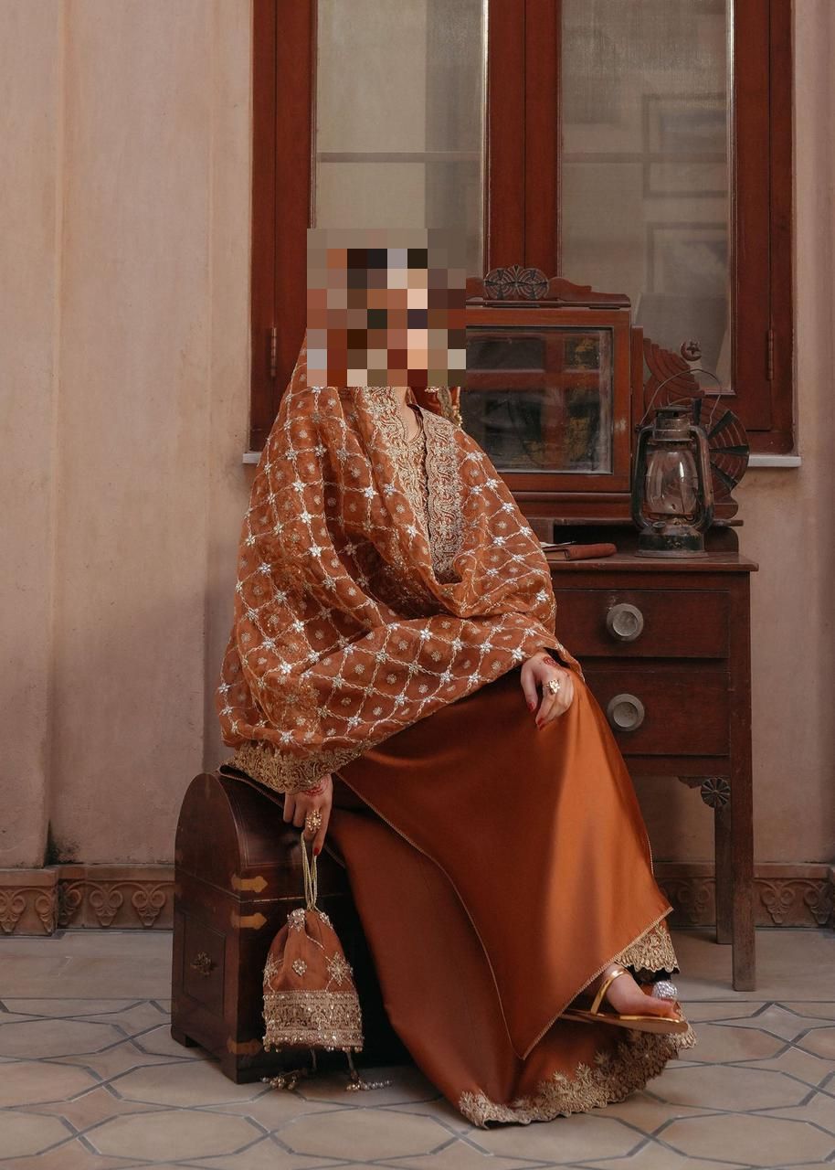 Rich in warmth and layered with quiet luxury, Ayesha’s Antique Copper Party Dress is designed for women who gravitate toward heritage tones, refined metallic depth, and dignified festive elegance.