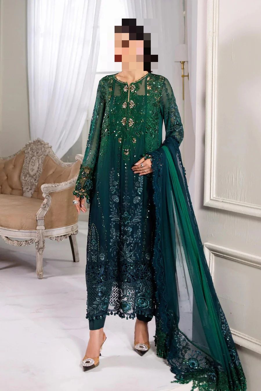 Ayesha’s Deep Jade Evening Party Dress is designed for women who want their elegance to feel powerful, polished, and enduring.