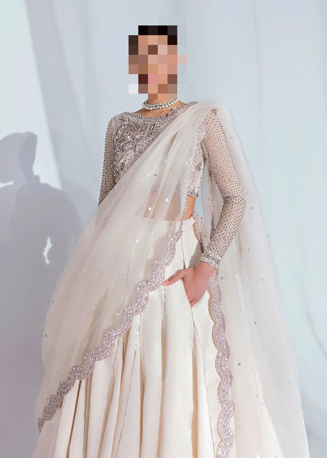 The versatility of pearl white makes this ensemble suitable for a wide range of celebrations — from day events to grand evening receptions.