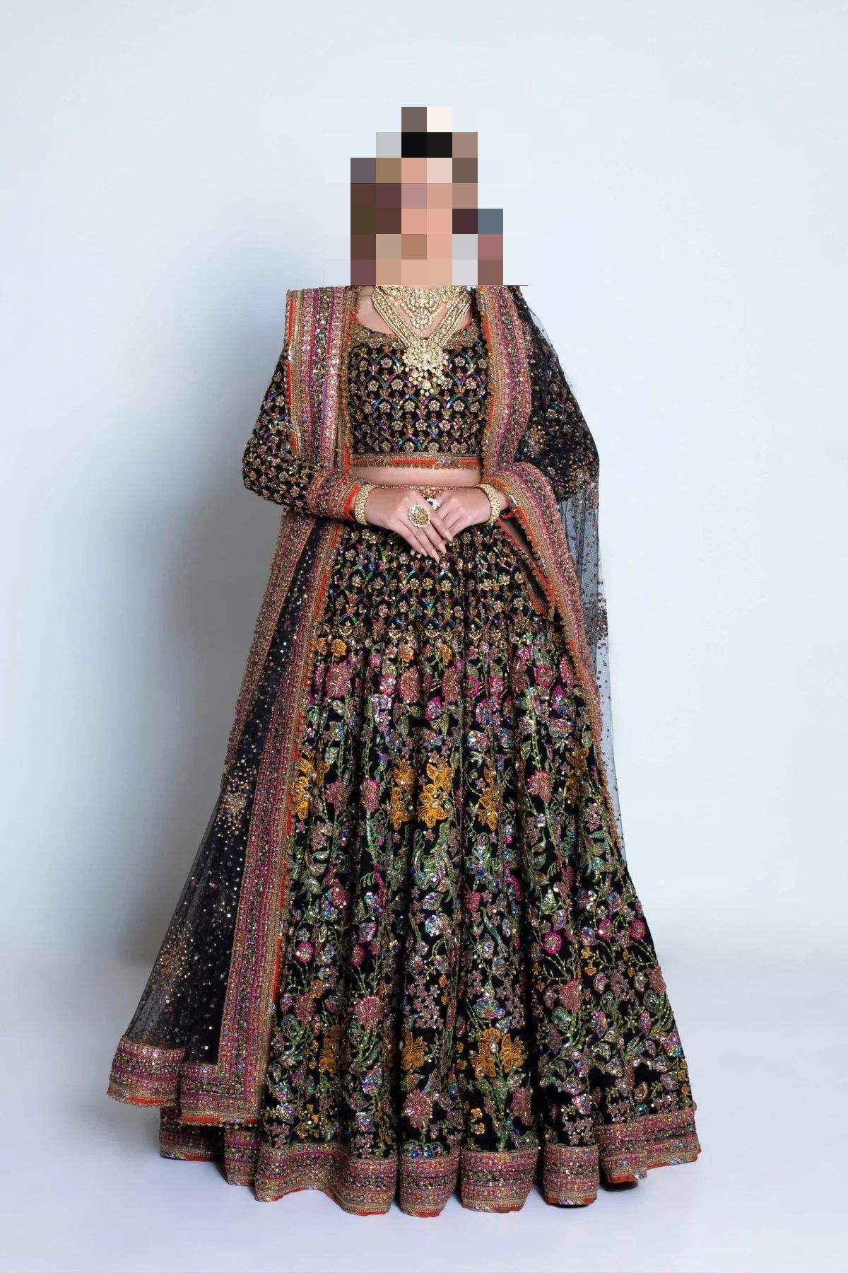 👗 Silhouette Structure — A flared lehenga-style silhouette adds dramatic volume while maintaining graceful movement.