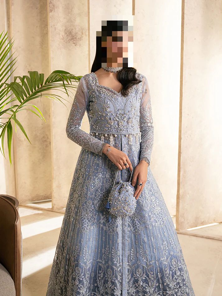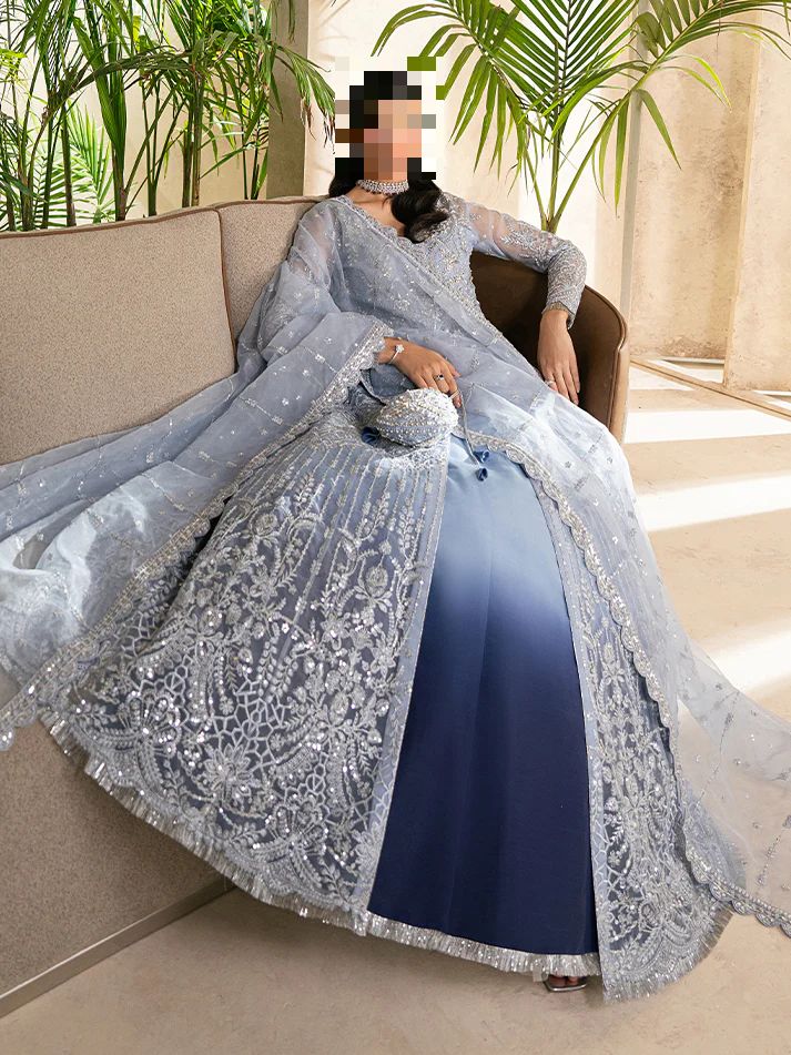 Ayesha’s Soft Steel Blue Wedding Dress earns this distinction through its controlled embroidery, serene color palette, and fluid silhouette.