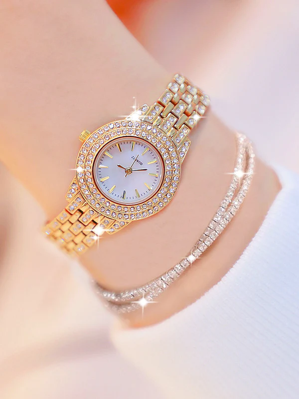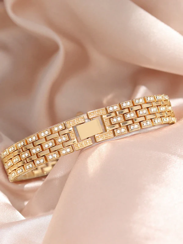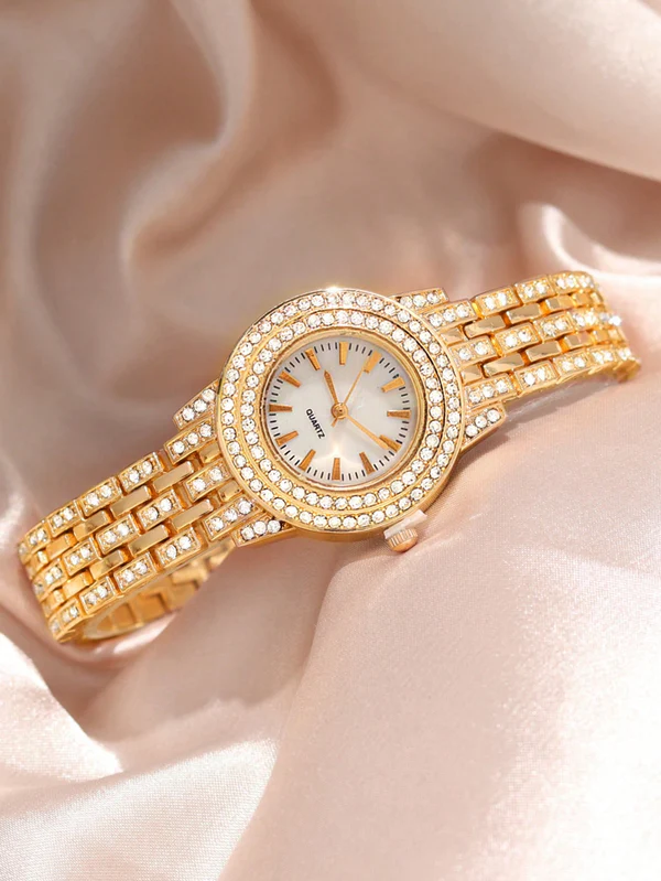 One of the most eye-catching features of the Charming Shein Gold Steel Diamond Watch & Bracelet Set is the rhinestone detailing.