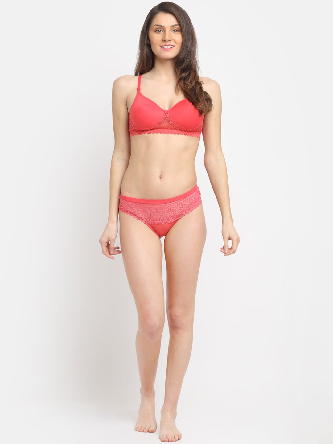 The Friskers Self Design Ladies Bra Panty Set features a subtle self-design pattern that enhances its visual appeal.